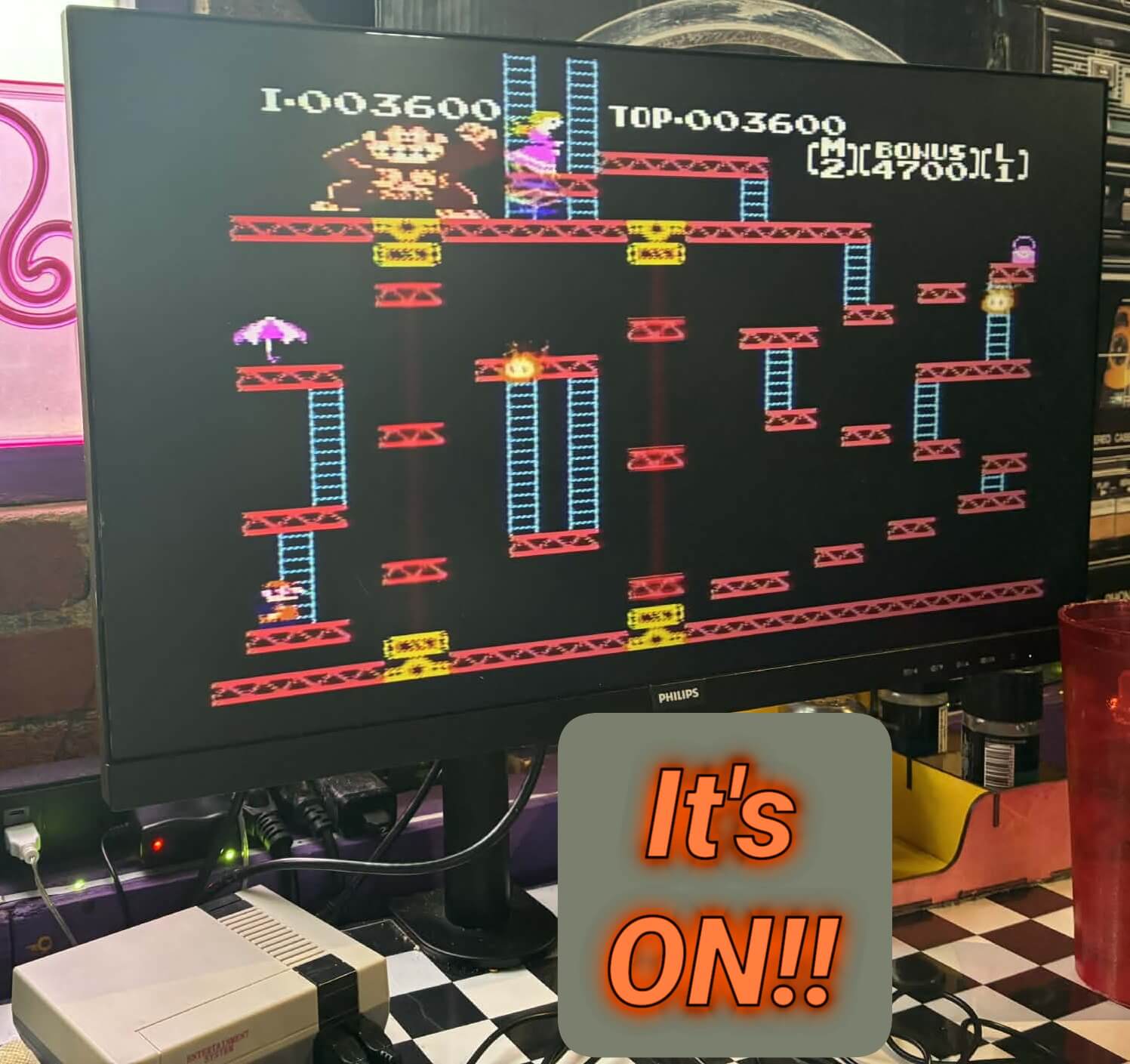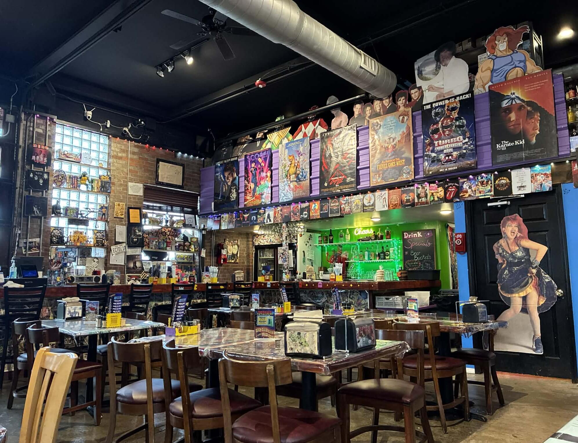 Full-on ’80s and ’90s nostalgia. Think neon colors, arcade games, movie posters, loud music, and every pop culture reference you remember from childhood plastered on the walls.