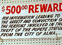 The original Popeye statue was made of fiberglass and papier-mâché and was erected in 1987 when Alma declared itself the “Spinach Capital of the World.” That statue kept getting stolen – so much so that the city eventually offered a $500 reward for information leading to the arrest and conviction of whoever was taking it.