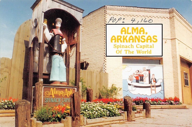 Popeye’s Garden is a tiny public park tucked into the corner of Fayetteville Avenue and Walnut Street in downtown Alma. In the center, a bronze Popeye statue stands proudly in a fountain, quietly stealing the show.